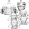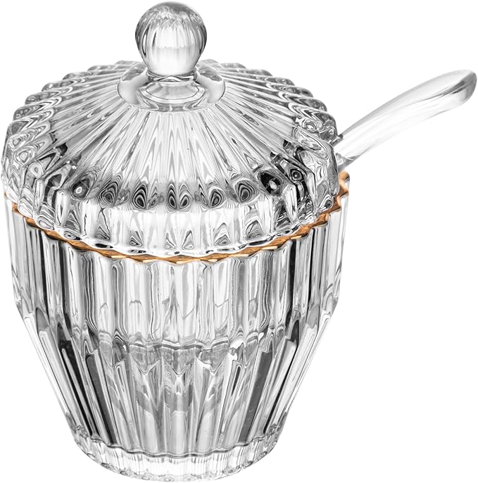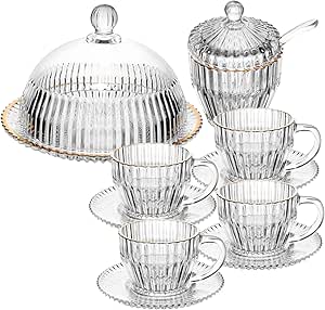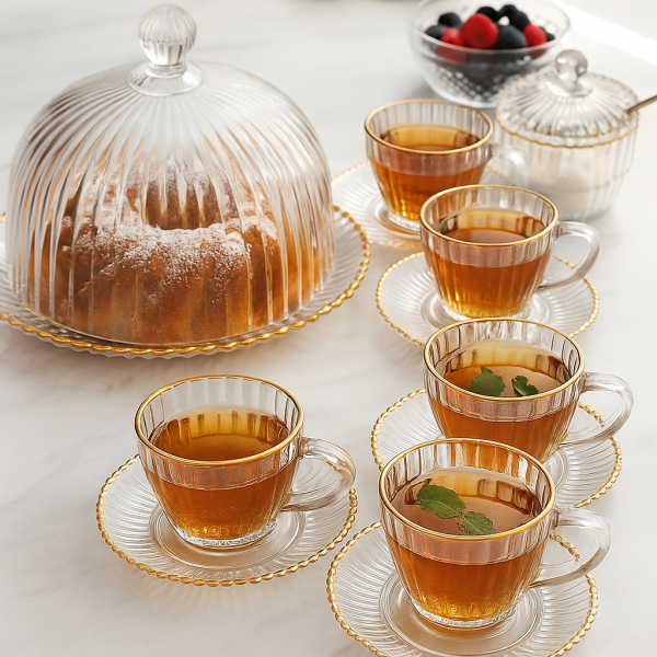 Composto por 4 xícaras com pires, açucareiro com tampa e uma boleira com cúpula, cada peça é cuidadosamente trabalhada em vidro texturizado de alta qualidade, que reflete a luz de forma delicada, realçando o brilho do acabamento em fio de ouro.